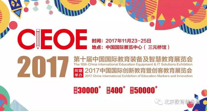 2017年11月23日至25日,第十屆中國國際教育裝備及智慧教育展覽會將在北京中國國際展覽中心舉辦,屆時會有400+國內(nèi)外展商展出包含教育信息化、智慧校園、創(chuàng)客教育、在線教育、校園新風等相關(guān)產(chǎn)品、技術(shù)及解決方案。